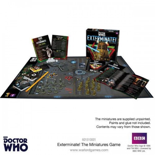 12 Daleks Time War en plastique faciles à installer 12 Cybermen Cyber ​​Legion en plastique faciles à installer 14 Cybermats en plastique Battlemat double face 36 "x 36" Décor de carte 34 cartes de recrutement 56 cartes Aventure 36 cartes bataille Livret de règles de 16 pages Livret Aventures de 12 pages Guide de 24 pages du livret Time  Vortex 10 dés de combat 2 fiches de référence rapide Règle de carte 59 jetons cartes À l'intérieur de l'Exterminate! jeu, nous avons lancé les choses en incluant des règles et des cartes vous permettant d'ajouter le Judoon , les Zygons et les Silents à vos jeux (modèles non inclus - disponibles séparément Miniatures fournies non montées et non peintes. Peintures et colle non incluses.
