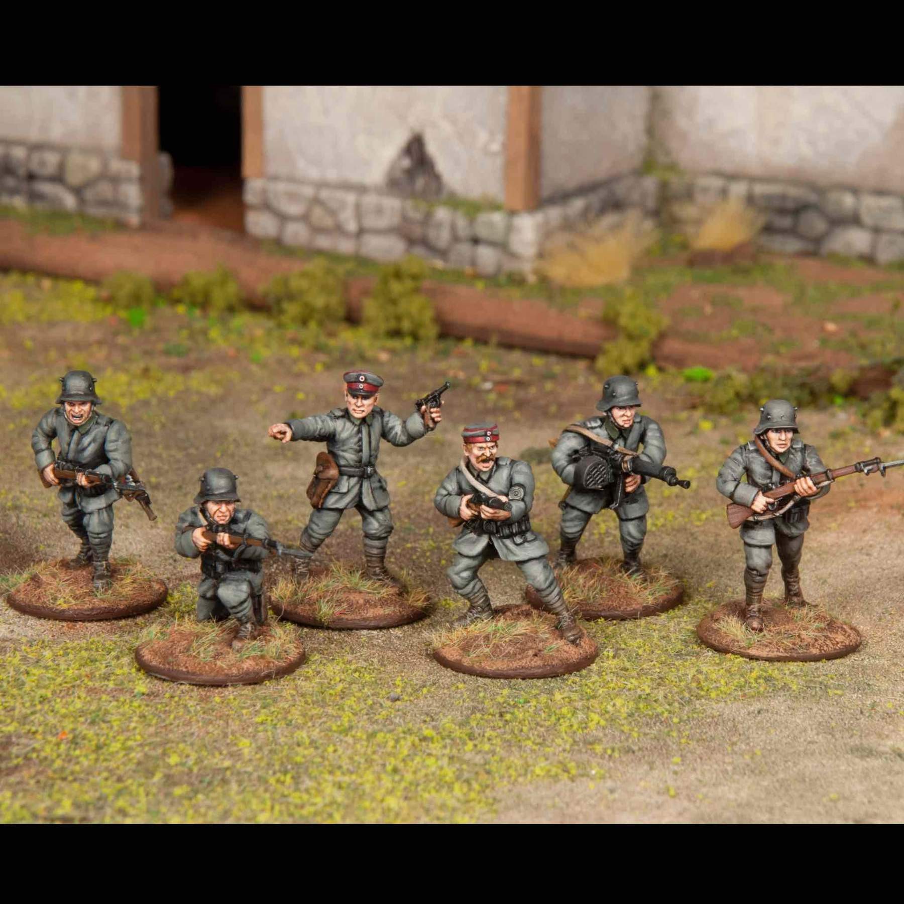 Ce coffret en plastique dur vous permet de construire jusqu'à 30 fantassins allemands équipés de fusils, MP-18, MG-08/15, grenades, pistolets et armes au corps à corps. Nous avons également inclus suffisamment de têtes pour équiper chaque figurine de stahlhelm, de casques avec masque à gaz, de feldmütze (casquette de champ) ou de pickelhaube.