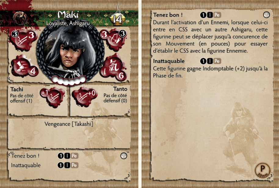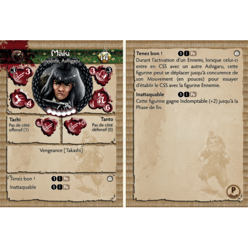 Maki offre la même imprévisibilité que ses camarades Ashigaru avec son Hold the Line ! Ki Feat. Son Unassailable Ki Feat lui permet de rester sur un flanc repoussant plusieurs adversaires puis d'utiliser son Sidestep pour se libérer de l'enfermement.