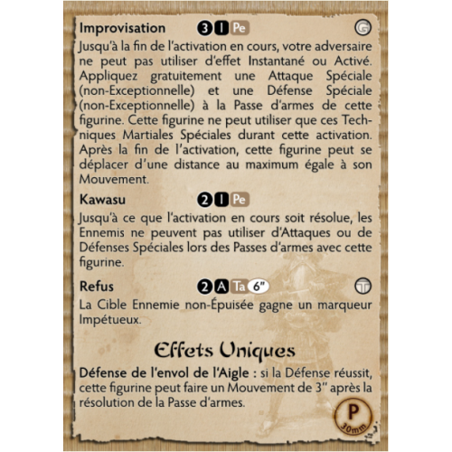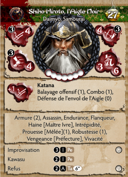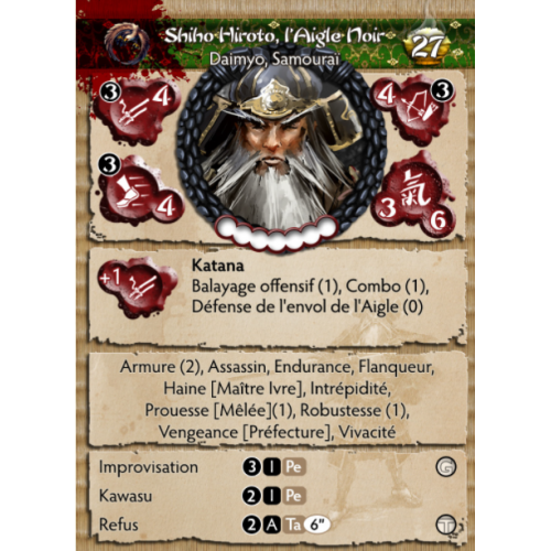 Shiho Hiroto s'est faufilé dans les îles de Jwar à la tête d'un groupe de mercenaires mortels venus de terres lointaines, aux côtés d'un cortège dévot de guerriers vétérans qui se sont ralliés à sa cause pendant son séjour à l'étranger dans les entrailles de l'Empire du Doré. Soleil. Ses objectifs sont simples : revendiquer cette préfecture lointaine pour lui-même, puis exercer sa vengeance sur les Takashi pour ce qu'ils ont fait à son père et à son clan. L'Aigle noir est un puissant samouraï à part entière, devenant encore plus meurtrier à la tête d'une force de frappe Shiho rajeunie. Il n'aura pas de repos tant que les soldats du Clan du Dragon ne seront pas morts dans la boue de sa patrie. Jwar sera à lui !