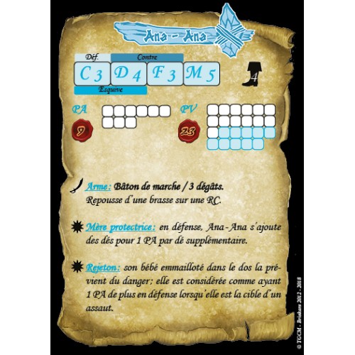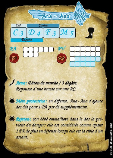 Ana-Ana est une jeune mère de famille attentionnée, elle accompagne ceux de son clan au combat pour qu'ils bénéficient de ses talents de guérisseuse mais jamais ne quitte son cher bambin.