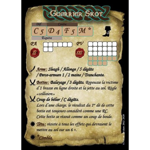 1 figurine imposante en résine et son socle texturé de 80 mm, 2 figurines résine et leur socle texturé de 40 mm, cartes de profil, réglette en brasse, 1 dé à 10 faces et un fascicule de démarrage rapide Sculpture et peinture: Emmanuel Pontié.