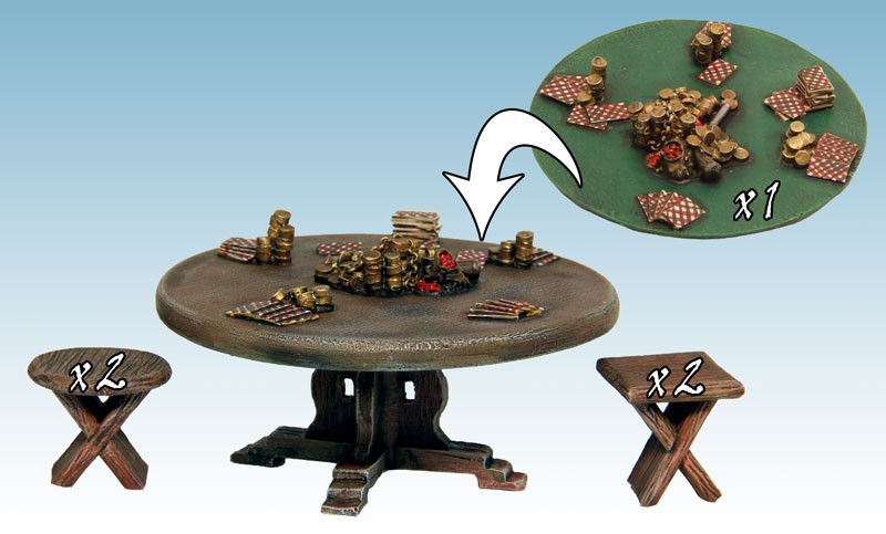 7 éléments résine: le plateau, le piètement, le tapis garni de mises et de cartes, 2 tabourets ronds et 2 tabourets carrés.