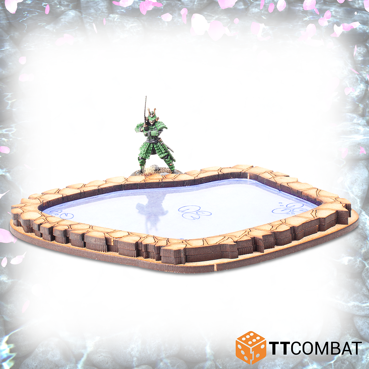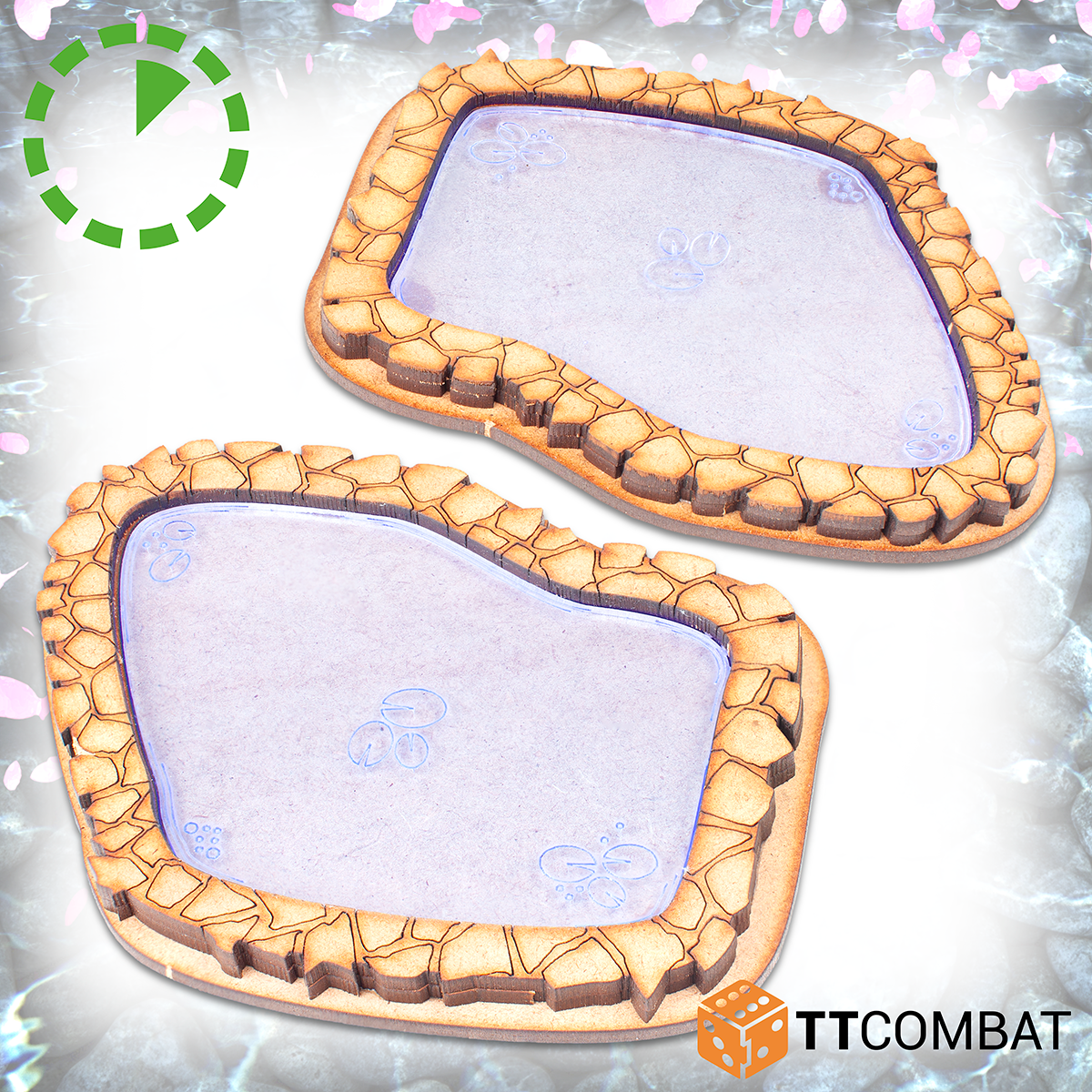 Les bassins sont fabriqués à partir de MDF de 3 mm et d'acrylique bleu de 3 mm. C'est un excellent kit de décors à utiliser dans les jeux de guerre fantastiques ou modernes, et fonctionnera parfaitement avec des figurines de 28-32 mm.