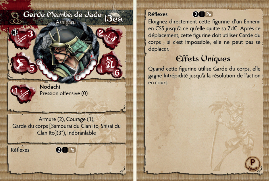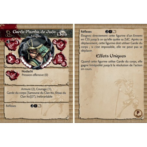 Les Shisai et Samurai du clan Ito ne ressentent aucune peur, même au cœur des territoires ennemis, lorsqu'ils sont escortés par la Jade Mamba Guard. Leur loyauté envers les dirigeants d'Izu est totale et incontestable. Leur nombre composé de fidèles d'Orochi et un processus de sélection strict garantissent que seuls les meilleurs restent et sont autorisés à assumer l'honneur de garder l'élite Ito. Bien que la formation soit un secret bien gardé, on murmure que le test final pour la recrue est de mettre sa main dans un panier contenant le mortel Jade Mamba, si la loyauté de la perspective n'est pas totale, elle est mordue et laissée mourir dans des conditions atroces. agonie.