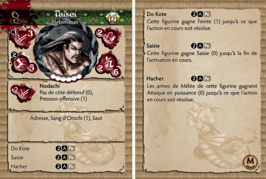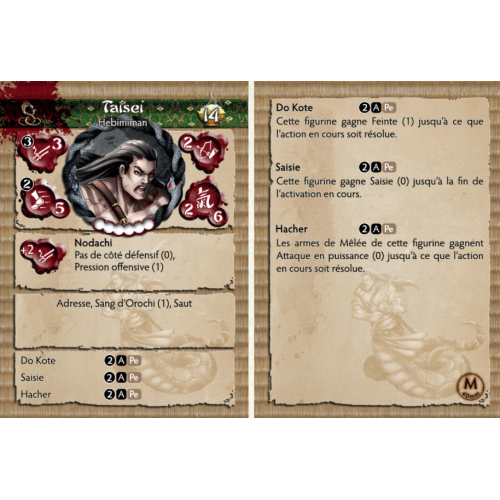 Au plus profond des temples froids et humides d'Orochi où se cachent les plus grands cauchemars, Taisei attend, ne conservant son énergie que pour l'appel d'offres du seul vrai Kami. Ses prouesses physiques en font un spécimen impressionnant du Hebi, sa grande force lui permettant de manier le no-dachi avec une agilité effrayante, une puissance redoutable ou d'écraser un ennemi sous des bobines musclées, immobilisé et impuissant à la merci des impitoyables.