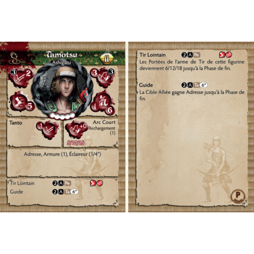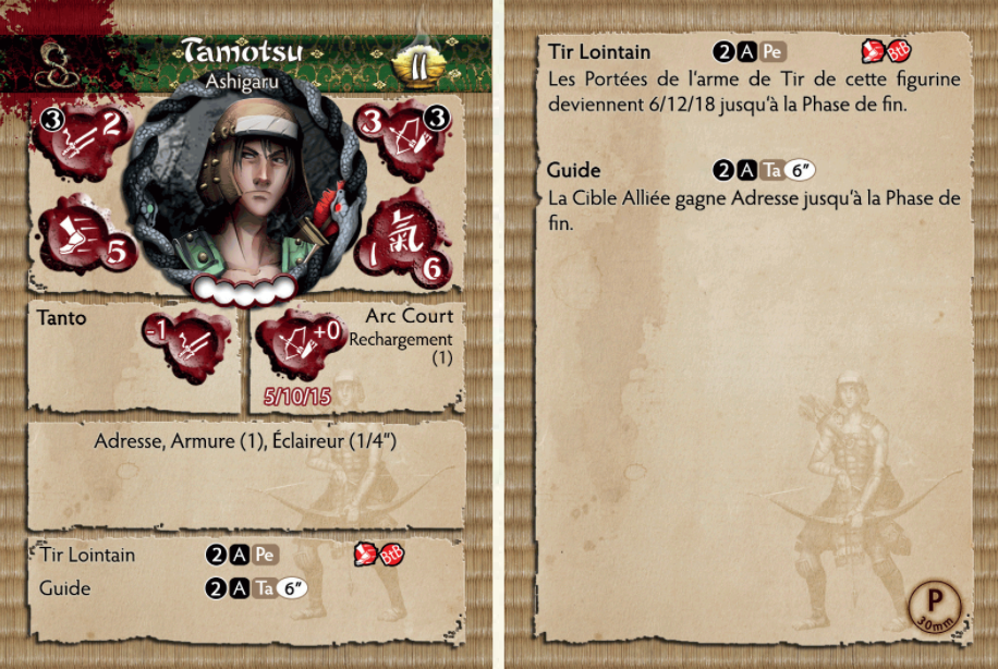 Là où la préfecture a adopté les nouvelles avancées des armes à poudre, les Ito ont toujours préféré concentrer leurs poursuites martiales sur les armes plus traditionnelles, en particulier l'arc court que leurs archers manient avec beaucoup d'effet. Leurs archers sont rapides et mortels sur le terrain d'Izu, et leurs arcs légèrement plus petits permettent un mouvement maximal dans les jungles. Tamotsu est un éclaireur doué, un chercheur de pistes et une partie intégrante des efforts de guerre de l'Ito.
