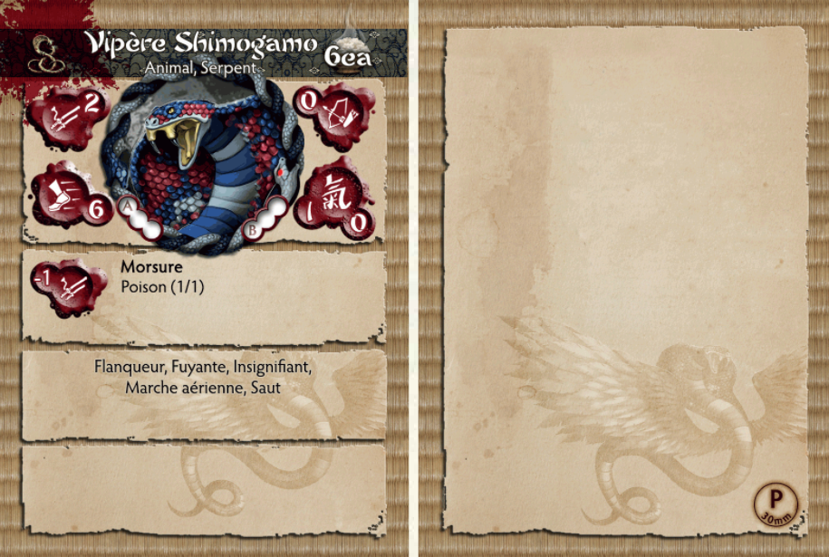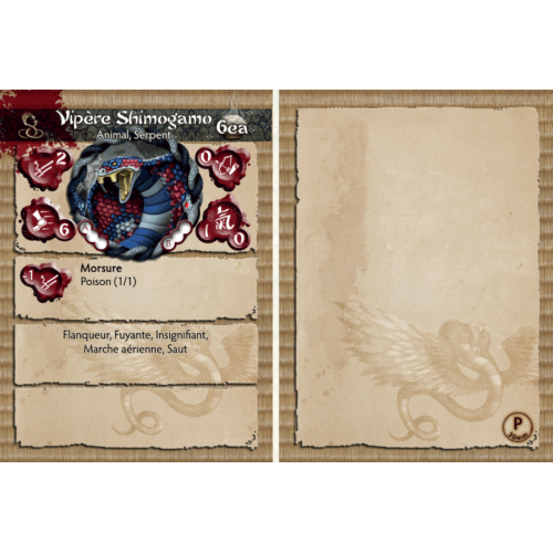 L'île d'Izu est l'un des endroits les moins habitables de l'ensemble des îles Jwar, conférée aux Ito en guise d'affront par le clan de l'Aigle pour qu'il soit clair pour tous, y compris leur clan subordonné, qui règne. Un paysage accidenté avec peu de terres arables pour l'agriculture, débordant de dangers et de dangers du terrain hostile ou de ses habitants, des bêtes uniques à l'île remplissent ses jungles denses. Aussi beaux qu'exotiques, avec des couleurs qui font paraître les jardins royaux ennuyeux en comparaison. Parmi les nombreux reptiles qui se cachent dans l'ombre de la canopée, les vipères de Shimogama sont parmi les plus grandes et les plus meurtrières. Cinq pieds de muscle, harnachés par de grandes ailes plumeuses, permettent la grande puissance et le mouvement du serpent, frappant sans avertissement et disparaissant tout aussi rapidement.