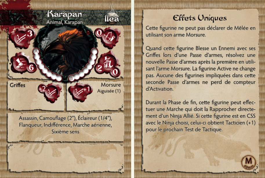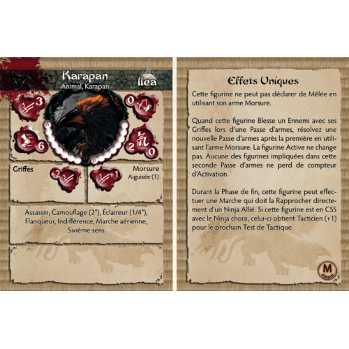 Cultivés depuis des générations, les Karapan sont la bête de somme ultime pour le Kage Kaze Zoku. De nombreux Worms sont sacrifiés dans le programme d'entraînement long et ardu de chaque Karapan. La traque, la furtivité d'une panthère combinée à la mobilité vicieuse du corbeau ne laisse aucune proie à l'abri. Pour ceux qu'il chasse, il ne peut y avoir aucune protection. Pour ceux qui cherchent à dissimuler leurs intentions au Grand Maître, il ne peut y avoir de cachette.