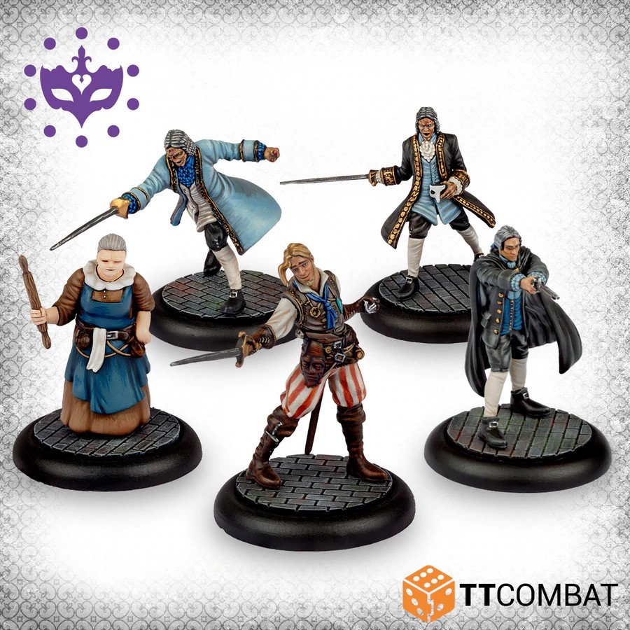 Cette boîte est une excellente extension pour tous les joueurs de Patriciens. Les deux membres du personnel de maison sont excellents pour protéger leur noble, tandis que les deux nobles syphilitiques fournissent des prouesses au combat égales à la plupart des choix de chef. Le véritable joyau de la boîte est l'adroit Adventuring Noble, qui - récemment revenu de lointaines jungles - apporte avec lui des talismans enchantés, faisant de lui l'un des seuls personnages patriciens capables de lancer des sorts magiques.