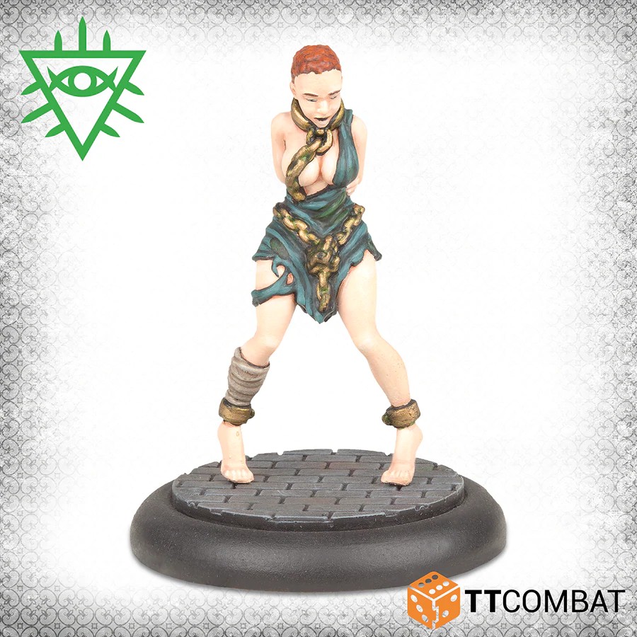 Cet ensemble contient trois esclaves, ligotés et attendant d'être mangés. Les esclaves sont peut-être les pires combattants de Carnevale, mais les joueurs de Rashaar en font quand même un grand usage : comme boîtes à lunch portables pour leurs monstres !