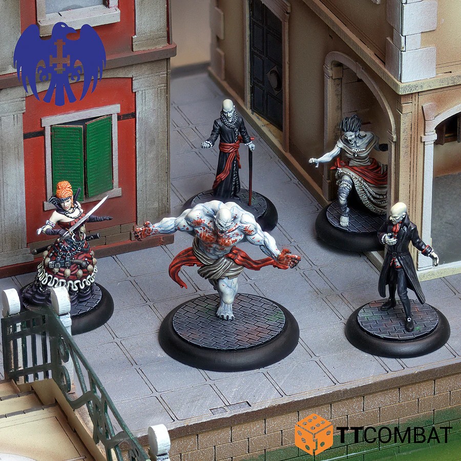 L'aristocratie vampirique montre les deux extrêmes des Strigoi ! Deux Nosferatu sont des sbires de soutien subtils, excellents pour prendre des objectifs. Une servante de haute naissance est si désespérée de recevoir le baiser de sang qu'elle dépensera ses richesses pour le culte. Un Dhampir affamé commence faible mais devient plus fort en buvant, et le Hulking Moroi est un énorme monstre rempli de rage !