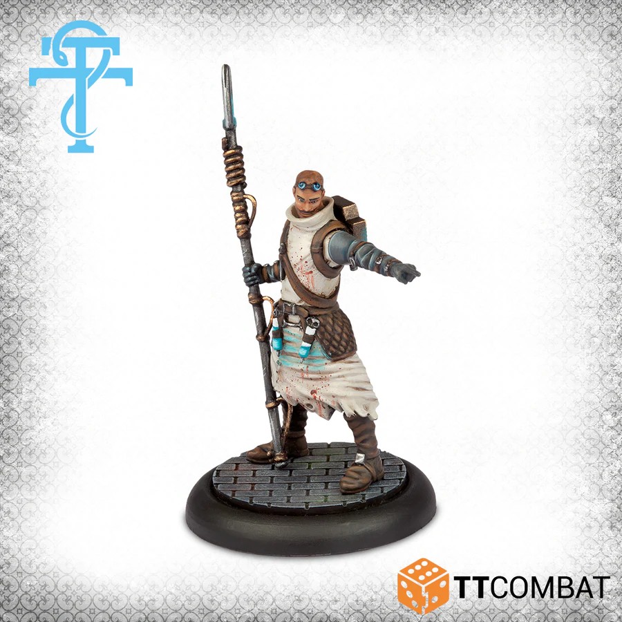 Cette boîte contient de vrais poids lourds pour un gang de médecins. Le Docteur des Bêtes est un mage puissant, et a un contrôle total sur le Lion viciou et le Gorille ailé farouchement protecteur. La force est soutenue par deux assistants de laboratoire, leurs aiguillons de choc fonctionnant aussi bien sur les combattants ennemis que sur leurs propres carrières.