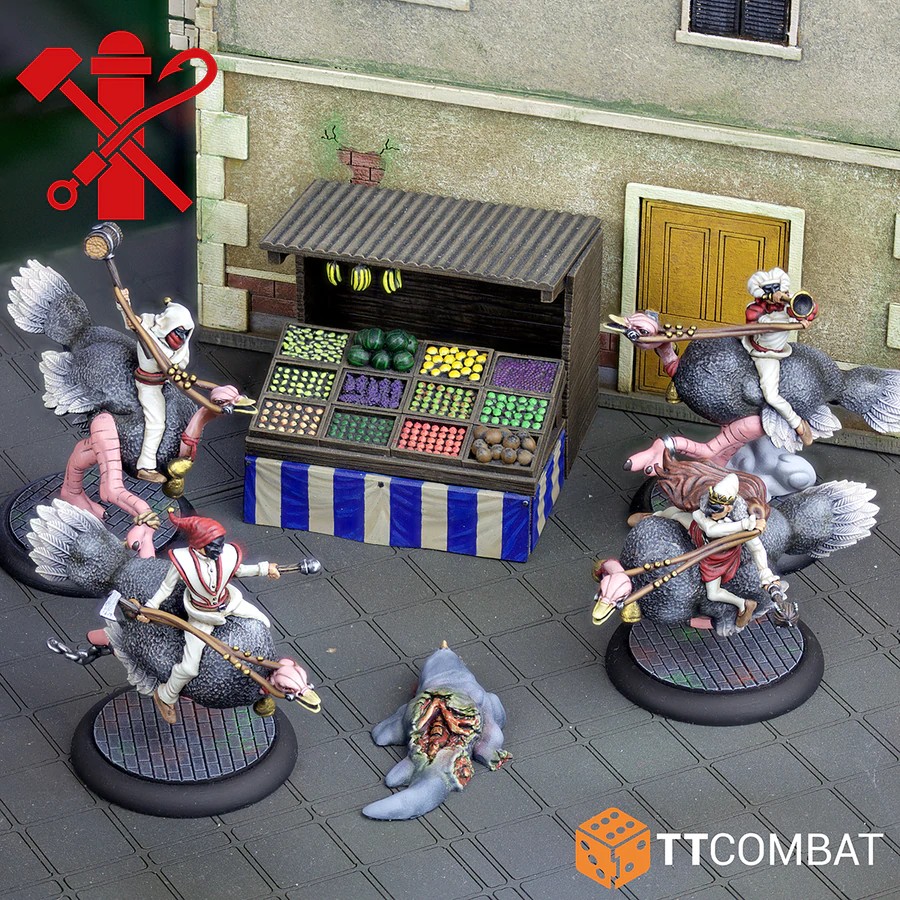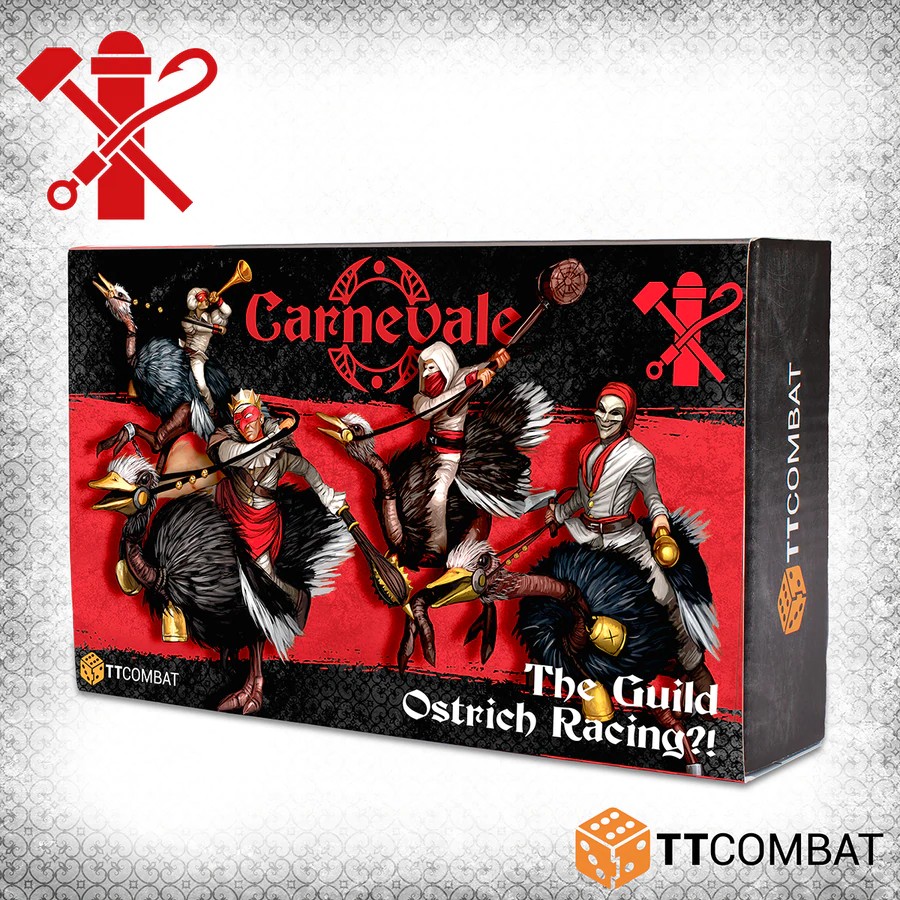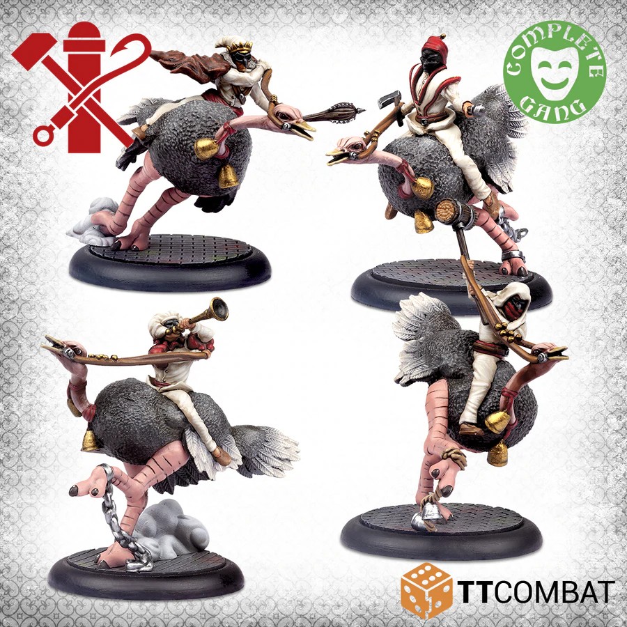 C'est vrai, vous avez bien vu. Ce sont quatre Pulcinella chevauchant des autruches. Après les avoir volées dans une cargaison destinée aux Docteurs, ces bêtes bipèdes sont la monture parfaite pour une bande de Pulcinellas fous ! Cette boîte contient en fait un gang entièrement légal. Avec deux cavaliers d'autruche comme choix rapides d'homme de main, une autruche très bruyante (celle qui sonne une corne) comme choix de héros de soutien et le roi de l'autruche comme chef, ce gang entre rapidement et est super bizarre. Juste au moment où vous pensiez avoir vu tout ce que Carnevale a à offrir !