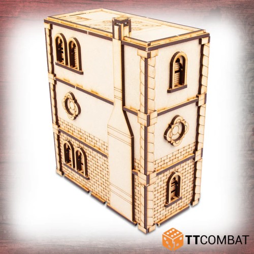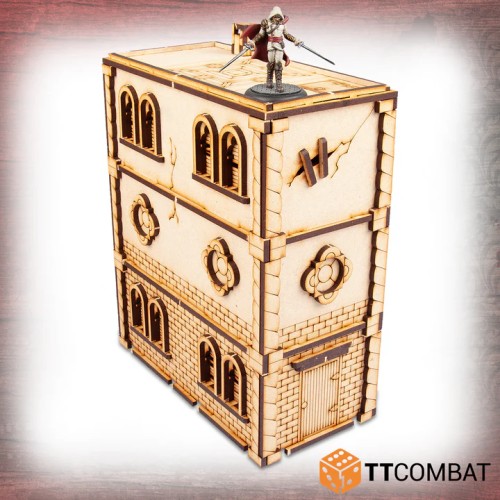 Ce kit est fabriqué à partir de MDF de 3 mm et a été conçu pour Carnevale, utilisant plusieurs étages pour grimper et sauter, et des toits à angles faciles afin que les miniatures ne tombent pas lorsqu'elles traversent l'horizon vénitien. C'est un excellent décor à utiliser avec d'autres jeux 28-32 mm.