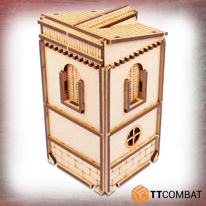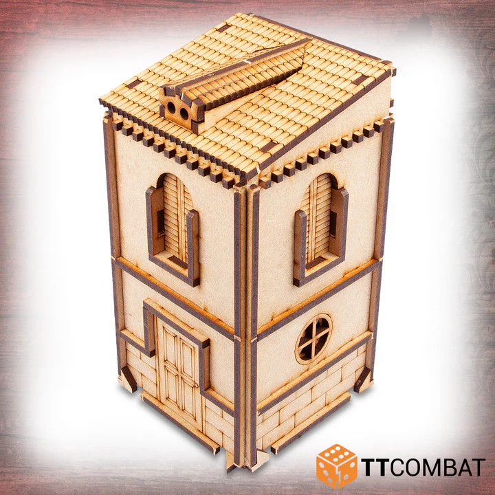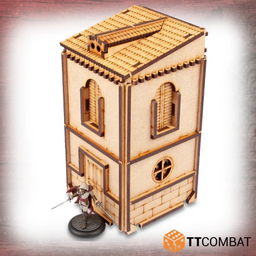 Ce kit est fabriqué à partir de MDF de 3 mm et a été conçu pour Carnevale, utilisant plusieurs étages pour grimper et sauter, et des toits à angles faciles afin que les miniatures ne tombent pas lorsqu'elles traversent l'horizon vénitien. C'est un excellent décor à utiliser avec d'autres jeux 28-32 mm.