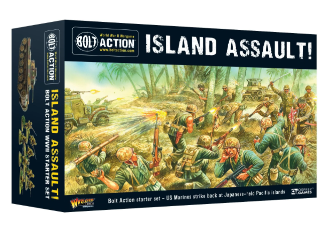 Contenant deux forces opposées parmi les nombreuses îles du théâtre du Pacifique, Island Assault! contient les règles de Bolt Action 2ème édition ainsi qu'un livret de scénarios vous guidant dans vos premiers pas dans le jeu. Bientôt, vous ajouterez à votre nouvelle armée et ferez des ravages sur vos ennemis, qu'ils se battent pour l'Oncle Sam ou l'Empereur !