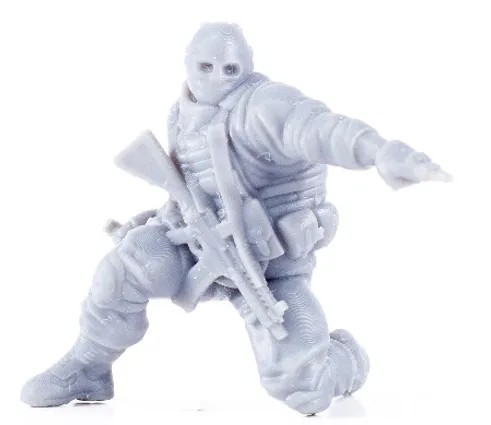 Précision sur le modèle peint : il s'agit d'un test d'impression qui a été peint. Il n'était pas encore équipé de son arme en bandoulière. Le modèle vendu comporte l'arme en bandoulière comme sur le visuel ci-dessus.