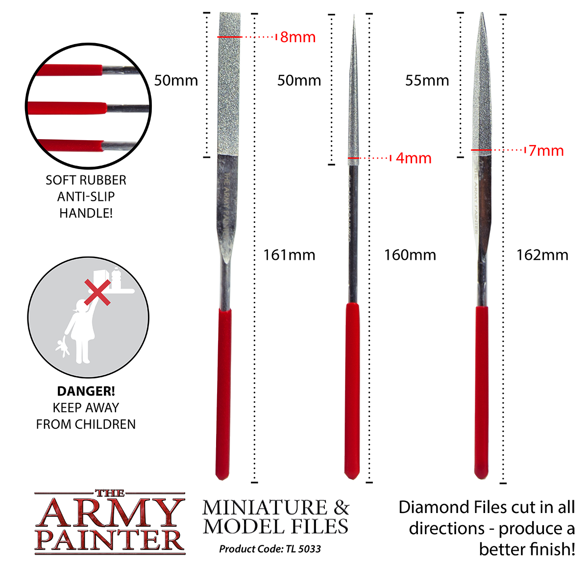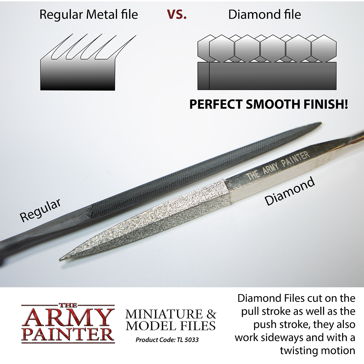 Ces limes diamantées 3x sont des outils extrêmement polyvalents pour le wargamer et l'amateur. Un incontournable pour les conversions personnalisées et le nettoyage des lignes de moules, ainsi que la préparation des pièces pour le collage. Fonctionne sur les surfaces en plastique, en résine et en métal.